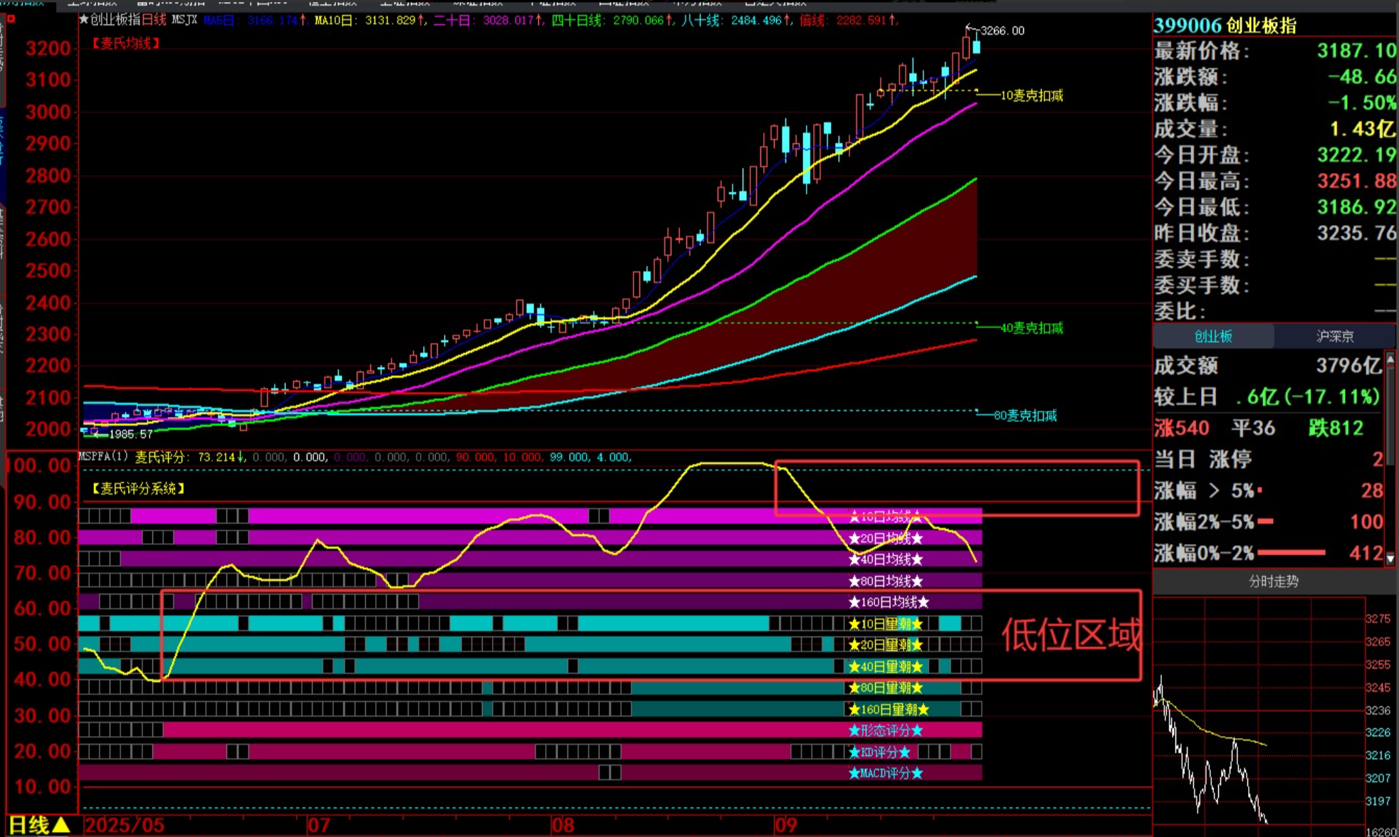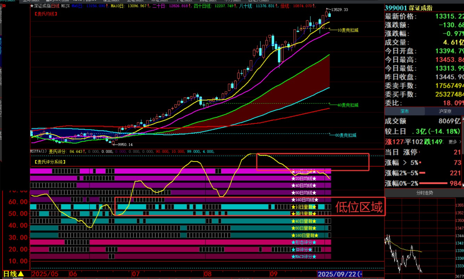 市场对 “深证成指、创业板指缩量创新高” 的争议(是打开空间还是高峰修整),本质是脱离 “量价同步性” 的主观判断。若用【麦氏理论】“均数量线 + 价格趋势” 的核心逻辑拆解,反而能找到清晰方向: