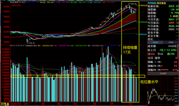 深市深证成指并非如此,尤其是创业板指数更持续长达17个交易日都缩量,构建了从5~10~20~40~80~160日均数量线全面下跌,这个形态与均线趋势形成典型的“量缩价涨”,一旦萎缩跨入20天周期再到压缩进入低位周期会再次喷出而涨,未来三个交易日是关键节点的转变,务必注意!