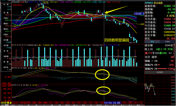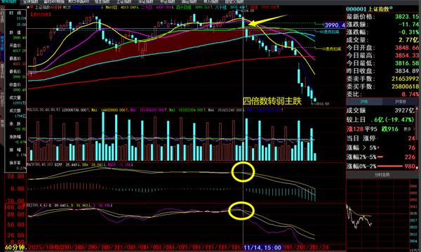 2025年11月14日周五跌破40日均线后到上周四高开低收,导致20及40日均线虽然尚未正式“同步死叉”,但它已经构成“同步助跌”,所以才导致上周五再进一步跌破回测80日均线的演绎。