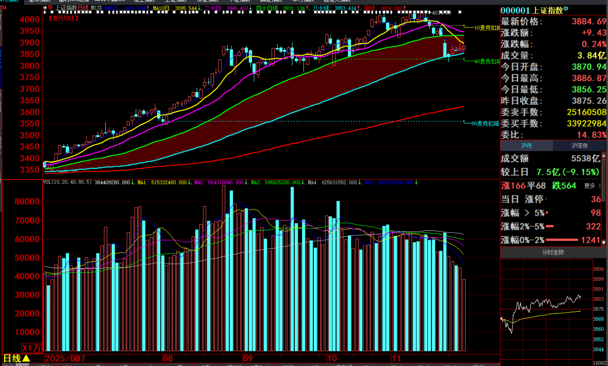 周四A股呈现显著分化,上证指数收红(沪强),深证成指下跌(深弱),符合此前预判。核心差异在于均数量线进一步萎缩(较周三更弱),反映两点信号。