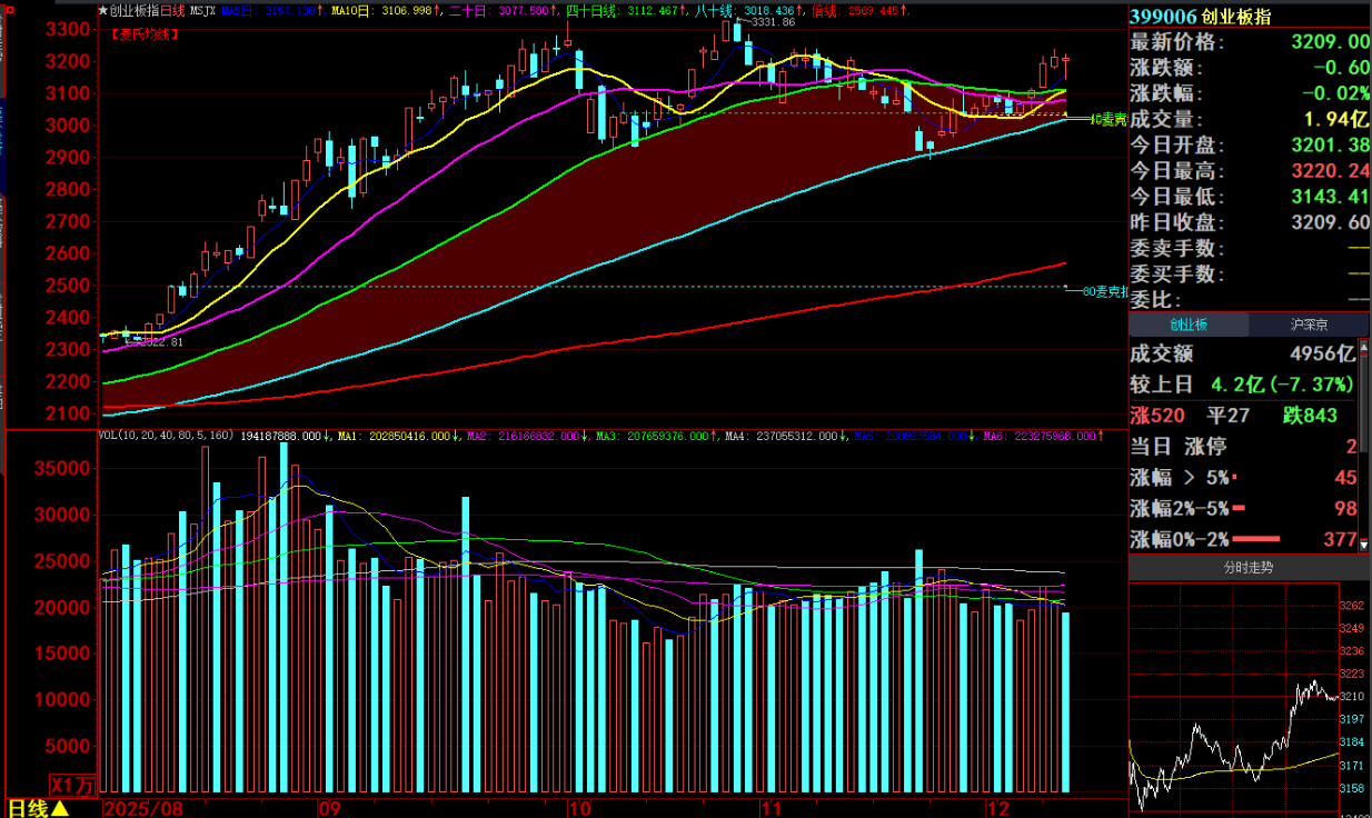 比较创业板指数一样有深证成指的基础但更强于后者,仅仅在成交手数换手上稍微弱一点,但因为100%滚动换手量只需要27天,敢买敢卖,敢追敢杀的操作手法使到创业板市场套牢盘不严重。近期从2025年9月19日缩量至今长达53天,平均值3118点,在不主动认赔杀跌的情况下,再进一步强势拔高上涨的动作会更明显,务必注意!