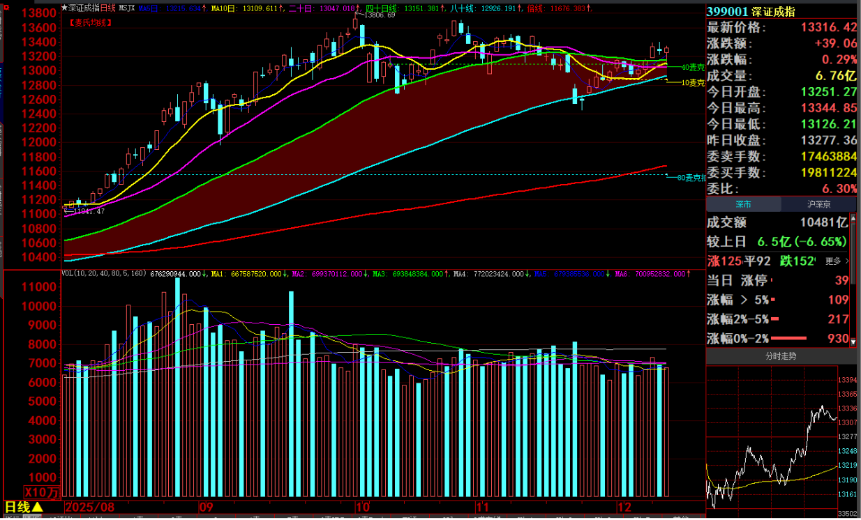 同样条件看深证成指,20~40~160日均数量线达到“一线牵”的平行,上方只剩下80日均数量线尚未反转助跌。“对比对称对应”上方80日均线却是助涨,同时深证成指站稳在40日均线13151点之上。这个是典型的优势结构与基础,足以构建有利的支撑甚或形成强势的“以量破价”推升助涨。