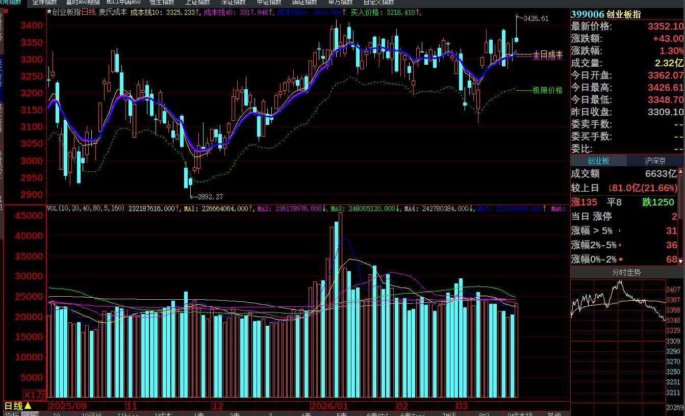 2、依据时间周期的演绎,可以直接出现在下周一直接压低后立马拔高,这个特征会提前反应在创业板市场,因为它的“成本线”构建明显强势的上扬,周五强势突破创新高没有放大量回测,说明筹码又经过一次洗盘,那么周一俱备随时再拔高的强势突破,这是整体创业板市场的领先作用;