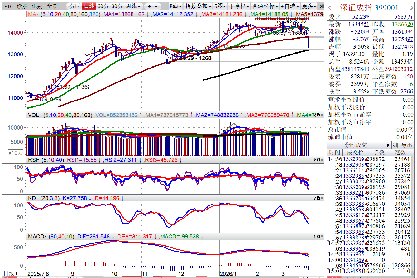 更重要是深证成指仅回到2025年12月22日收盘13332点,收盘比这个点位高,显示当时的低位拔高上涨发动攻势的点位没有被跌破,这个形态显示多方护守支撑的有效性。