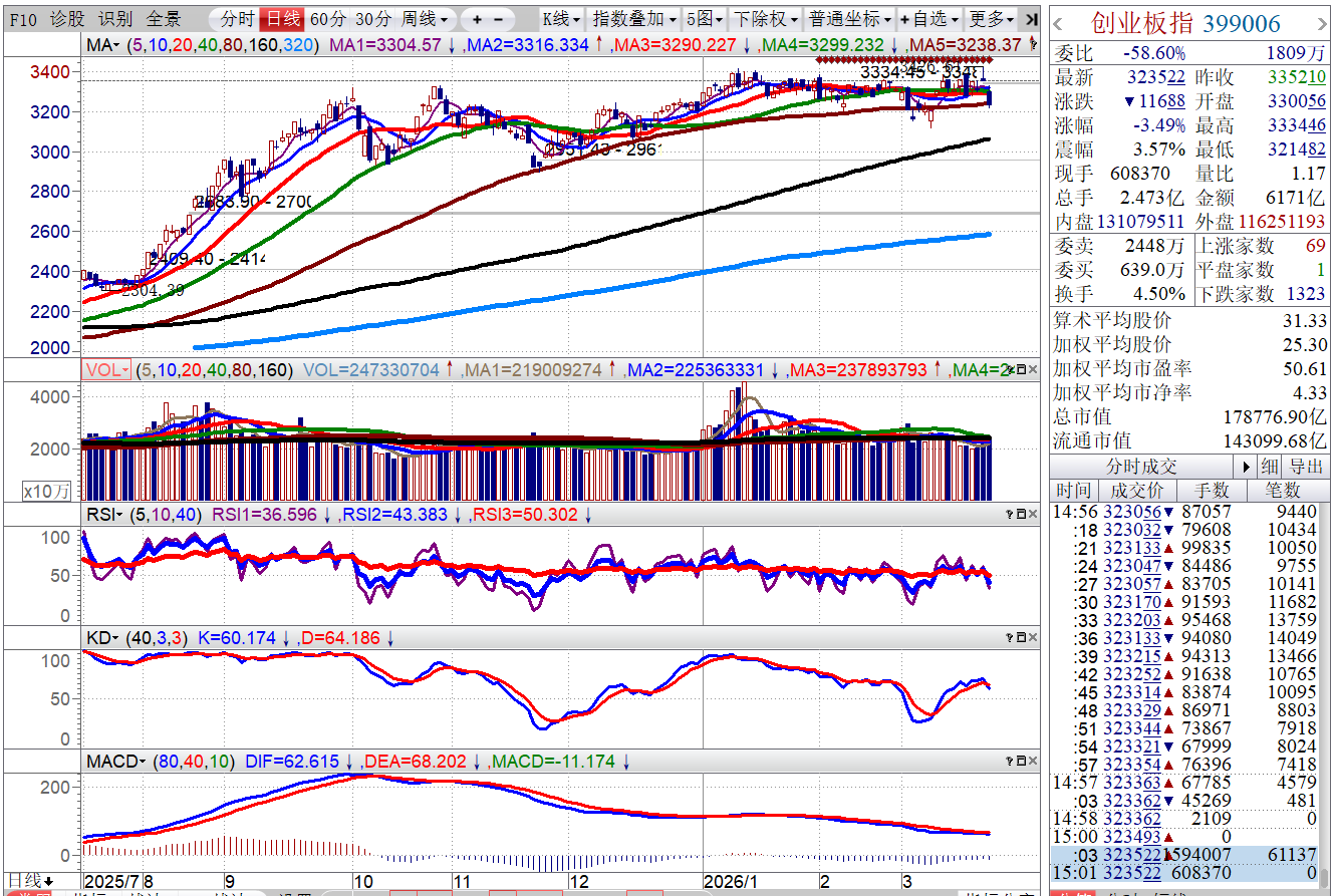 更重要的是创业板指数,虽然周一收盘3234点,下跌116点,跌幅3.49%,但指数指挥刀80日均线,还没有回测2026年3月6日收盘3208点,显示这个指数仍是强势回测。
