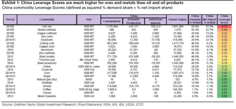 除了中国需求强劲(疲软)等同于大宗商品价格上涨(下跌)这一显而易见的关系外,高盛在报告中,以中国需求占比(的平方)加上中国净进口占比的方式对各主要大宗商品进行了“中国影响评分”,试图衡量哪些商品对于中国需求的风险曝露最大