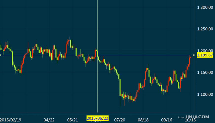 隔夜金价升至自6月22日以来高位,最高报1189.67美元/盎司。