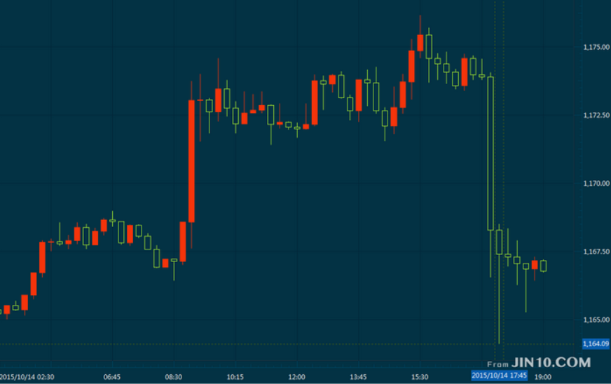 所谓无巧不成书,今日下午17:30之后,现货黄金价格急速下跌,15分钟内跌去近10美元,最低至1164.09美元/盎司。