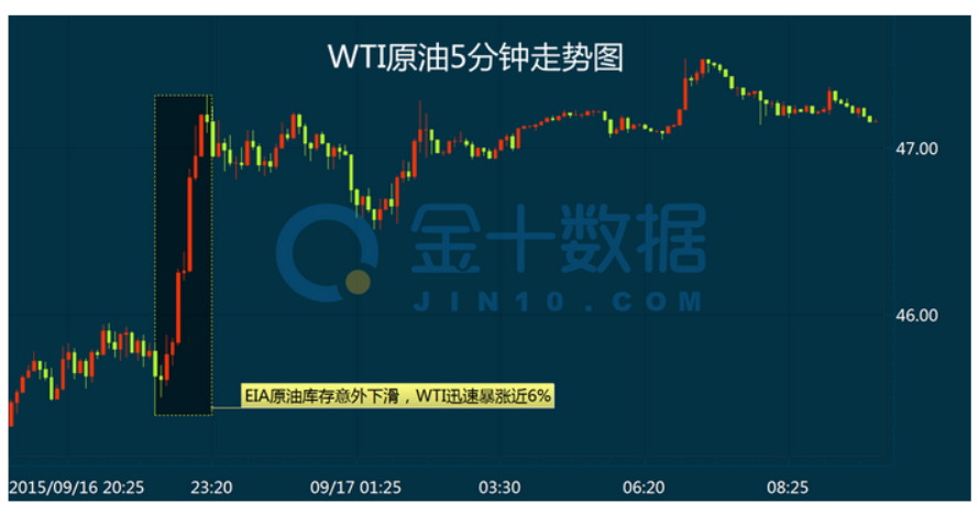 自周一以来,部分油市投机客押注上周美国原油库存骤降,之前市场数据公司Genscape估计库欣原油库存减少180万桶。美国能源信息署(EIA)公布的数据显示,截至9月11日当周美国原油库存减少210万桶,为8月28日当周以来最大降幅。库存数据对油市利多,数据公布后WTI迅速跳涨近6%,突破47美元/桶关口。