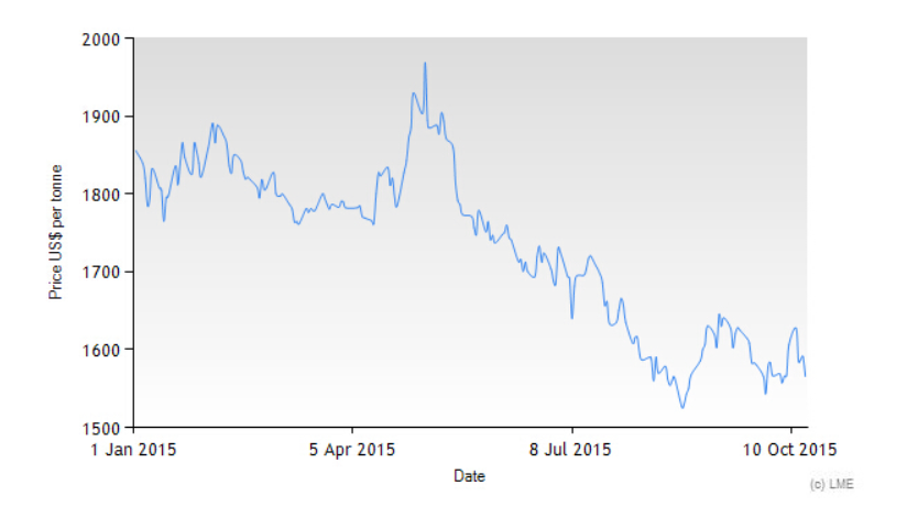 截至上周五,LME三月期交割的铝价为1565.71美元/吨,徘徊在六年低谷。今年以来铝价已经下跌了15%。法国巴黎银行估计,全球铝市场2015年存在100万吨供应过剩。而独立铝分析师Goran Djukanovic预计,今年全球铝市过剩的供应量可能达到300万吨。