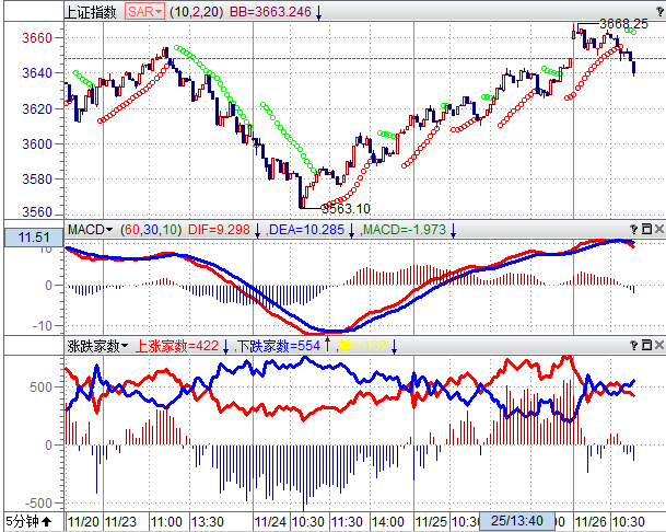1、上证指数的20KD在越过80°以上后始终维持高位不跌,严格计算时间从10月19日开始至今29天,是否会形成高位持续走高,然后形成一而再的高企与背离呢?此时要注意的是对比20日均价线的演变,在没有跌破20日均价线之前都不会任何的不稳定与危险,时间测算应该要到下周二才会达到高峰,此时多方可以在周线上瞬间逆势再拉高一把,所以判断沪指周五收周K线还可以拉高作收。创业板指数是否会受到沪指的优势而延缓下跌呢?这一点是存在相互影响,但到底影响程度如何?无法判断,必须要重视其周期影响,拉长达到35天的时间周期,难免会有疲弱或是疲累特征,务必要注意周K线的影响,尤其是下周有跌回2661点测试的倾向,必须留意;