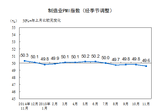 据国家统计局,中国11月官方制造业PMI 49.6,低于预期和前值的49.8,创下2012年8月以来的最低水准。