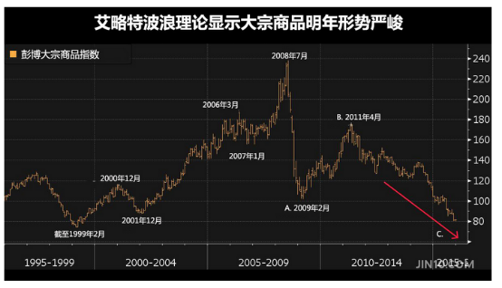 历经金融危机以来最糟的动荡后,大宗商品多头希望新的一年能够迎来转机,但是起源于经济大萧条年代的艾略特波浪理论却发出令人失望的信号。齐默尔曼表示,彭博大宗商品指数即使跌到16年低点,投资人还是必须再等一年才会有反弹行情。他表示: