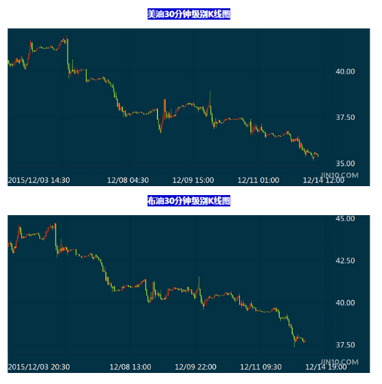 油价上周大跌逾12%,为2014年12月以来最大单周跌幅。美原油1月期货刷新09年2月以来低点至35.16美元/桶,布伦特原油1月期货最低触及37.36美元,刷新七年低位,收报37.93美元/桶。