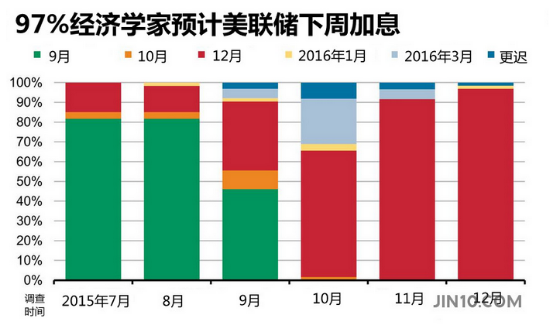 但自9月后全球经济下行风险有所减弱(10月时美联储FOMC声明中已将“全球经济不稳定”等措辞删减),加上褐皮书显示当前美国整体工资稳步上扬,全美12个地区当中有10个录得温和或稳定增长,房地产市场与贷款需求也有所改善,美国也逐渐接近耶伦主席口中的“加息时机”。经济学家们对本月加息的预期也变得更加自信,大多数受访者表示,美联储已没有不加息的理由。