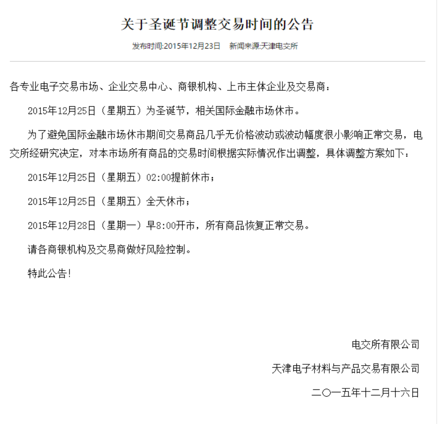 关于圣诞节调整交易时间的通知