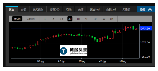 现货黄金周四开于1072.8美元,欧市录得日内低点1070.2美元后,美市开盘后一路上扬,创日内高点1077.1美元,之后小幅盘整,盘尾收于1075.13美元/盎司,上涨0.5%。