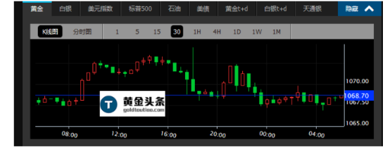 现货黄金周二亚市开于1068.80美元。欧市开盘后一路走跌,且振幅加大,录得日内高点1075.37美元后震荡下行。美市开盘后成横盘震荡走势,录得日内低点1067.38美元,最终收于1068.90美元/盎司,微涨0.2%。