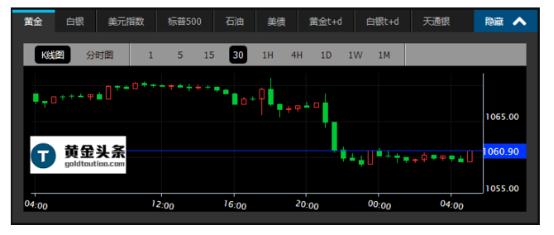 现货黄金周三亚市开于1069.10美元。欧市开盘后持续震荡,录得日内高点1072.33美元。美市开盘即大幅跳水超10美元,录得日内低点1059.30美元,之后横盘续跌,收至1061.20低位,跌幅0.72%。