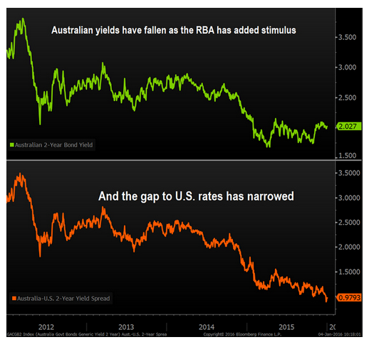 本周一,澳大利亚2年期债券收益率升破2%,两个月前还处于1.73%的低位。此债券品种与同期美国国债利差由2014年年末的151基点收窄至97基点。