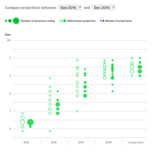 下图可见去年9月和上月两次会后公布的美联储官员利率预期。