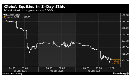 出于对全球尤其是中国经济增长的担忧,加上地缘政治紧张加剧和油价的再度暴跌,市场避险情绪并无减弱迹象。MSCI所有国家指数(MSCI All-Country World Index)在2016年前三个交易日累计下跌3.3%,至三个月最低水平。