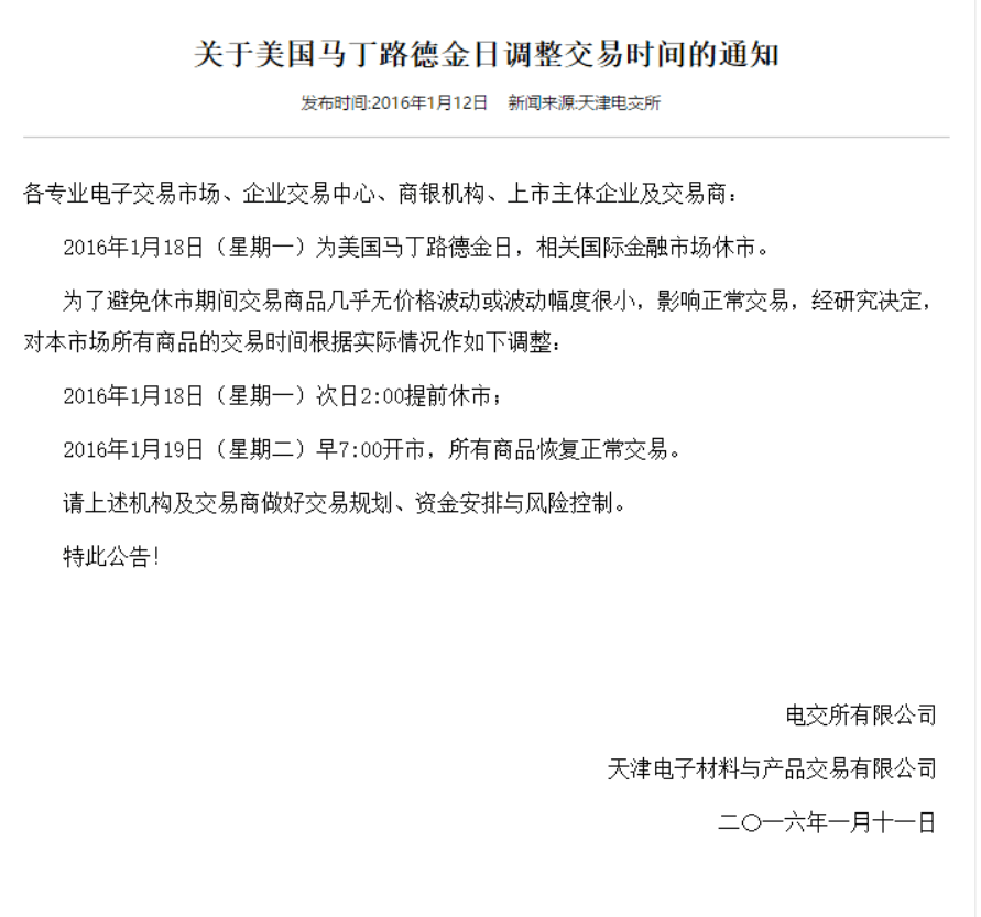 关于美国马丁路德金日调整交易时间的通知