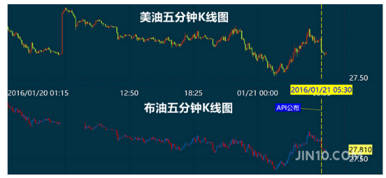 API数据公布之后WTI油价跌幅短线扩大0.25美元。截止北京时间周四7:00,WTI原油报28.33美元/桶,布伦特原油报27.81美元/桶。