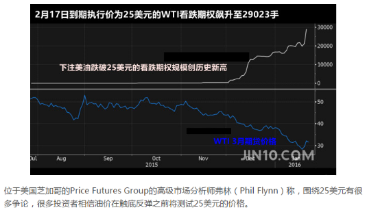 导读: 伊拉克产量数据和沙特阿美声明重燃悲观情绪,周一美布双油再度暴跌,WTI跌幅超7%,再跌破30美元关口;布伦特原油跌幅也超6%。彭博数据显示,2月17日到期执行价为25美元的WTI看跌期权规模飙升至历史新高。