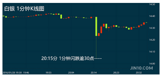 LBMA今天白银定盘价异常,官网显示为13.58美元/盎司,而现货白银价格在20:15时突然由14.39美元闪跌至14.04美元,然而黄金价格以及COMEX白银期货合约仍处于高位保持不变。分析认为,由于一些交易员看到今日伦敦白银定盘价在13.58美元/盎司,故引发抛售,逾5000手空单交易砸盘,致使白银价格一分钟内闪跌逾30点。