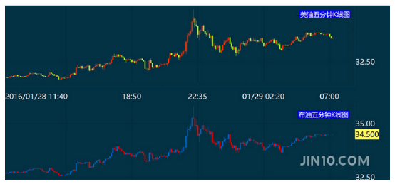 美国WTI原油周四(1月28日)收涨0.92美元,或2.85%,报33.22美元/桶;布伦特原油收涨0.79美元,或2.39%,报33.89美元/桶。沙特和俄罗斯合作减产的希望重燃令多头受到鼓舞,同时也进一步激发了大量的空头回补,油价受到提振连续三日收涨。此外,利比亚紧张局势、美国精炼油库存大降以及美元回落也为油价提供支撑。美国WTI原油期货价格盘中最高触及34.81美元/桶,布伦特原油期货价格盘中最高触及35.84美元/桶。