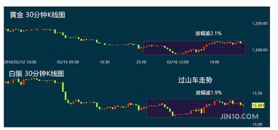 周二(2月16日)黄金探底回升,亚市因股市回暖致避险降温一度跌至1090.78美元/盎司附近,随后因油价重挫再次推升避险,金价回升至1216美元/盎司附近,本周剩下的时间金价将面临美联储的考验。原油市场则一度因市场预期产油国可能达成减产协议而暴涨6%,但减产愿望因仅达成冻结产量而落空,美原油重新跌回30美元/桶下方。截至北京时间00:30,黄金报1212.30美元/盎司;WTI原油报28.87美元/桶。