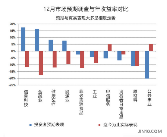 科维奇认为,对他们来说迄今为止,2016年的业绩表现仍相当不错,特别是今年加入了对投资者预期的考虑。科维奇在最近的报告中表示,在这一背景下,重新定位资产配置的方向则一点也不令人震惊。科维奇强调,下面的图表对比了今年部分产业的表现,与投资者12月的预期相比,大多产业的收益率走向似乎与投资者开了个玩笑。实际上,调查显示当市场处于负面情绪时悲观论点很容易蔓延,而此时做出的判断往往与实际背道而驰。