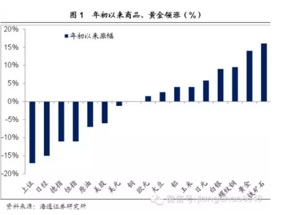 如果把今年以来所有资产价格的表现做一个排序,那么涨幅在10%以上的是黄金和铁矿石、涨幅在5%-10%之间的有螺纹钢、白银、日元等,涨幅在0-5%之间的有玉米、铝、大豆、欧元、铜等,跌幅在0-10%的有美元、美股和原油,跌幅在10%-20%之间的有恒指、德指、日经、上证指数等。