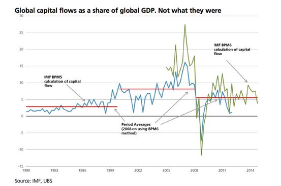 UBS分析师Paul Donovan和Sophie Constable称,资本流的全球化是伴随着1995年后的贸易全球化而起。但最近一次全球金融危机之后,却没有看到资本流动伴随贸易全球化复苏而恢复。