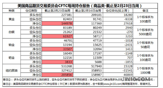 而美国商品期货交易委员会(CFTC)周五(2月26日)发布的报告显示,截至2月26日当周,投机者持有的原油投机性净多头增加46869手合约,至205856手合约,表明投机者看多原油的意愿上升;投机者持有的黄金投机性净多头增加27618手合约,至144978手合约,表明投机者看多黄金的意愿上升;投机者持有的美元投机性净多头减少1917手合约,至29425手合约,表明投机者看多美元的意愿下降。