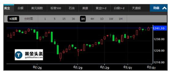 现货黄金周一亚市早盘开于1222.70美元/盎司,最高触及1241.40美元/盎司,最低下探1215.50美元/盎司,收于1238.10美元/盎司,上涨15.70美元,涨幅为1.28%