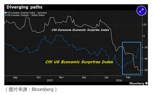 二月以来,花旗的美国经济意外指数上行,以及欧元区经济意外指数下行,再次形成交叉,暗示政策分歧或将出现。
