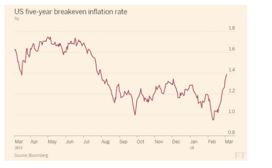所谓盈亏平衡通胀率,通过比较普通国债与通膨保值债券(TIPS)收益率之差,以推断市场对未来通胀的看法。