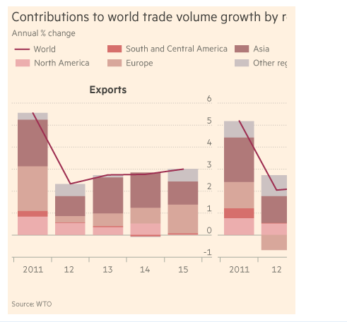 在这份报告中,WTO没有预测全球贸易反弹,为多年来首次。很多经济学家认为,自2008年全球金融危机以来,传统经济关系已经被考验,甚至破裂,而近年来全球贸易出现的异常模式仅仅是其中一个例子。