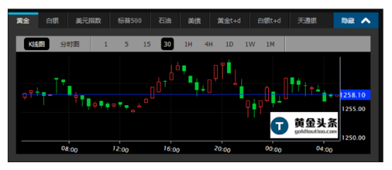 现货黄金周二亚市开于1258.70美元/盎司,之后波动较小走势平淡。欧市多头开始强烈上攻,录得日内高点1265.60美元后一路下挫。美市延续跌势,创日内低点1250.90美元之后触底反弹,收跌于1255.10美元/盎司下跌0.2%。
