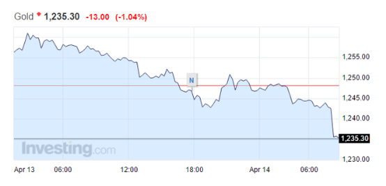 黄金期货短线下挫9美元,现报1236.00美元/盎司,日内跌幅扩大至1%。昨日中国数据利好,全球股市大涨。