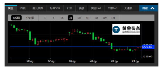 现货黄金周四亚市开于1241.40美元/盎司,之后大幅下挫直线跳水10美元;后止跌反弹再转小幅盘整。欧市震荡上行,录得日内高点 1243.90美元,之后冲高回落,再度大幅下挫。美市延续震荡下行,多头动能逐渐殆尽,最低跌至1223.80美元,之后跌势有所缓解,收于1226.90美元/盎司,跌幅为1.8%。