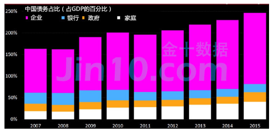 截至2015年底,中国整体经济的负债相当于GDP的246.8%左右,高于2014年底的231.5%,以及2008年底的163.8%,中国的信贷水平在2008年首次开始提速。