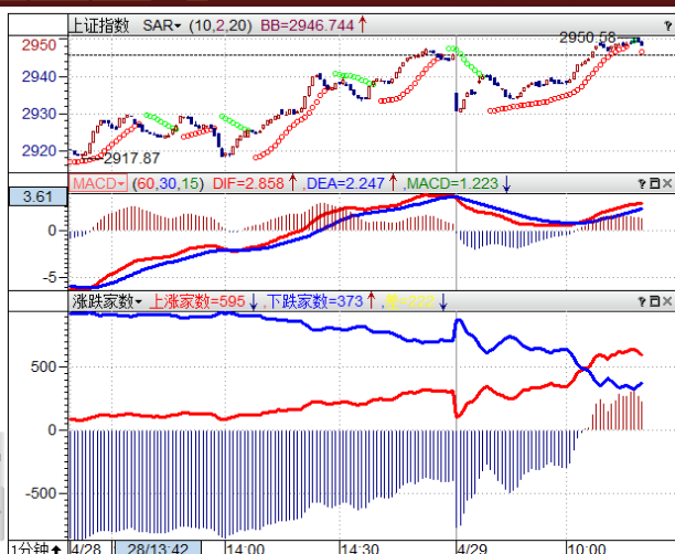 周五开盘到9点55分还是看不到多方在人气倾向上的转变与优势,所以可以判断目前还是偏向弱化的人气,多方很难借由人气的优势进一步反击。所幸今天在开盘后30分钟明显看出板块的集中优势,可惜没有看到权重板块的强化,无法稳定支撑指数,有拔高而涨收红的能力,但也只是小红格局。