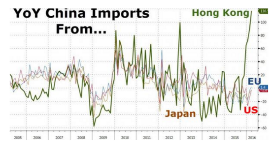 去年底以来的贸易资料显示,中国大陆对香港出口同比上涨幅度,远不及大陆从香港的进口幅度。此外,香港统计的对内地出口远高于内地从香港进口。下图显示中国自香港的进口去年底以来激增远高于从美欧日的进口增幅: