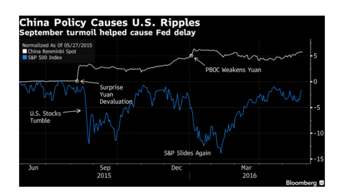 彭博下图展示了人民币汇率变动对标普500指数的影响: