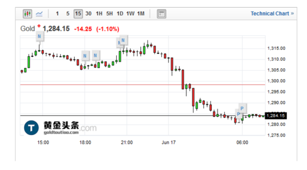 现货黄金周四亚市早盘开于1293.10美元/盎司后多头一路上攻,不断刷新前高。欧市延续涨势,美市延续涨势,开盘录得日内高点1315.20美元创22个月新高,之后黄金突然大幅跳水,一路狂跌,录得日内低点1277.90美元/盎司后,跌势有所放缓,终收于1278.40美元/盎司的低位。