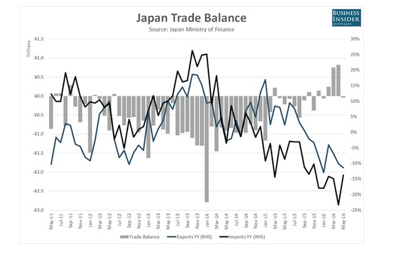 Business Insider的以下图表展示了日本进出口贸易增长变化,蓝线是日本出口同比增长走势。