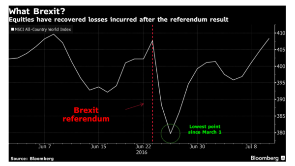 截至周二收盘,MSCI世界指数已经连续四个交易日上涨,累计涨幅达7.9%。全球范围内,英国公投结果公布后股市蒸发的3.5万亿美元市值,几乎已经全部收复。